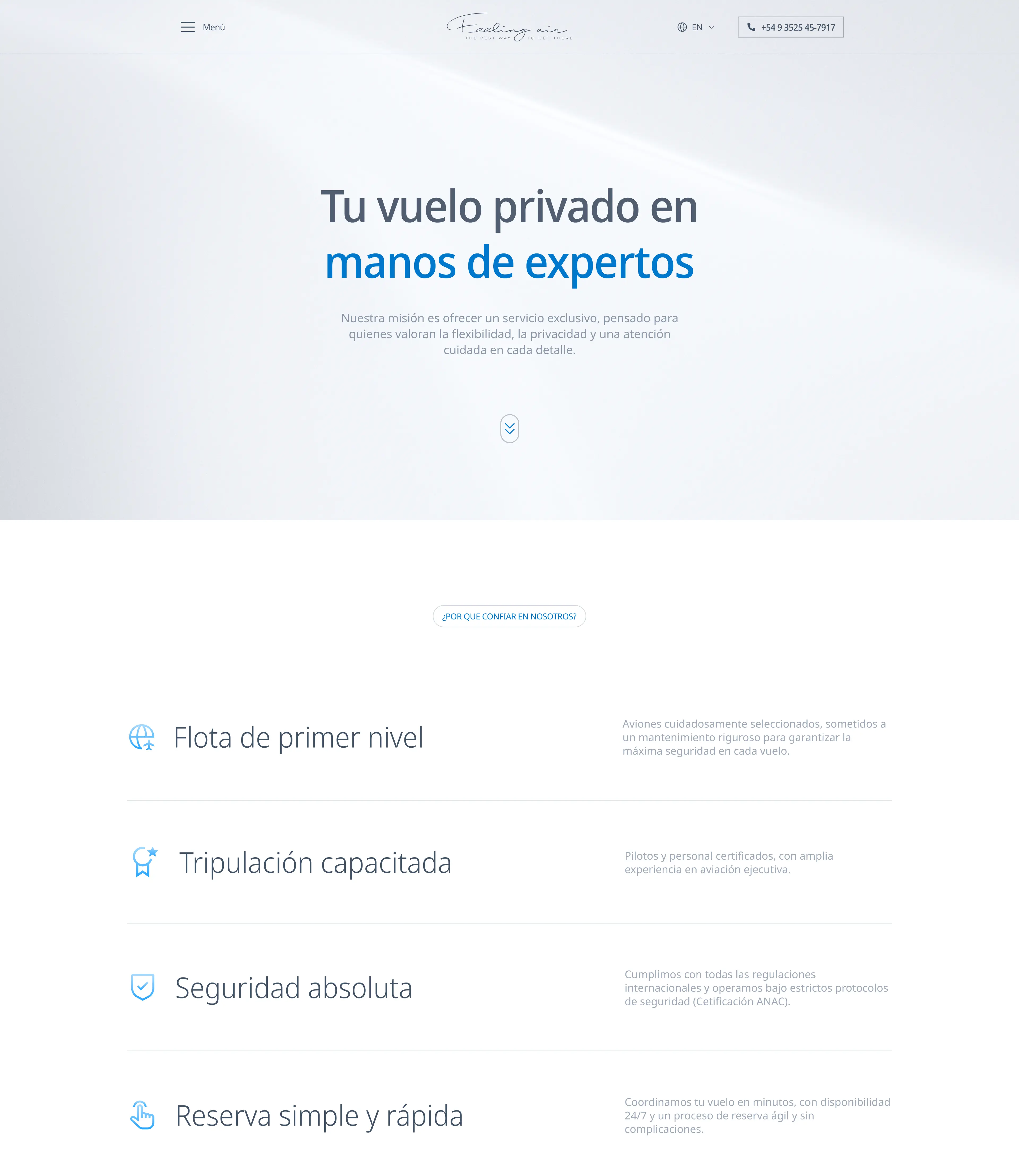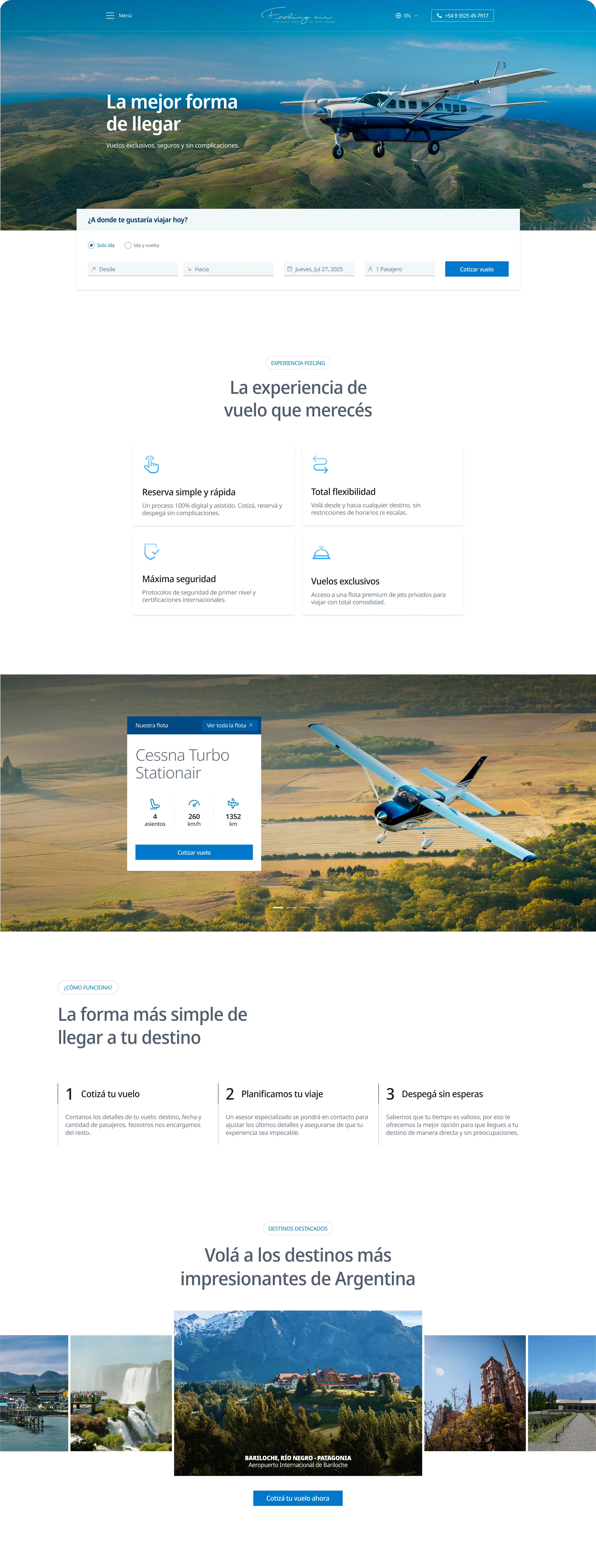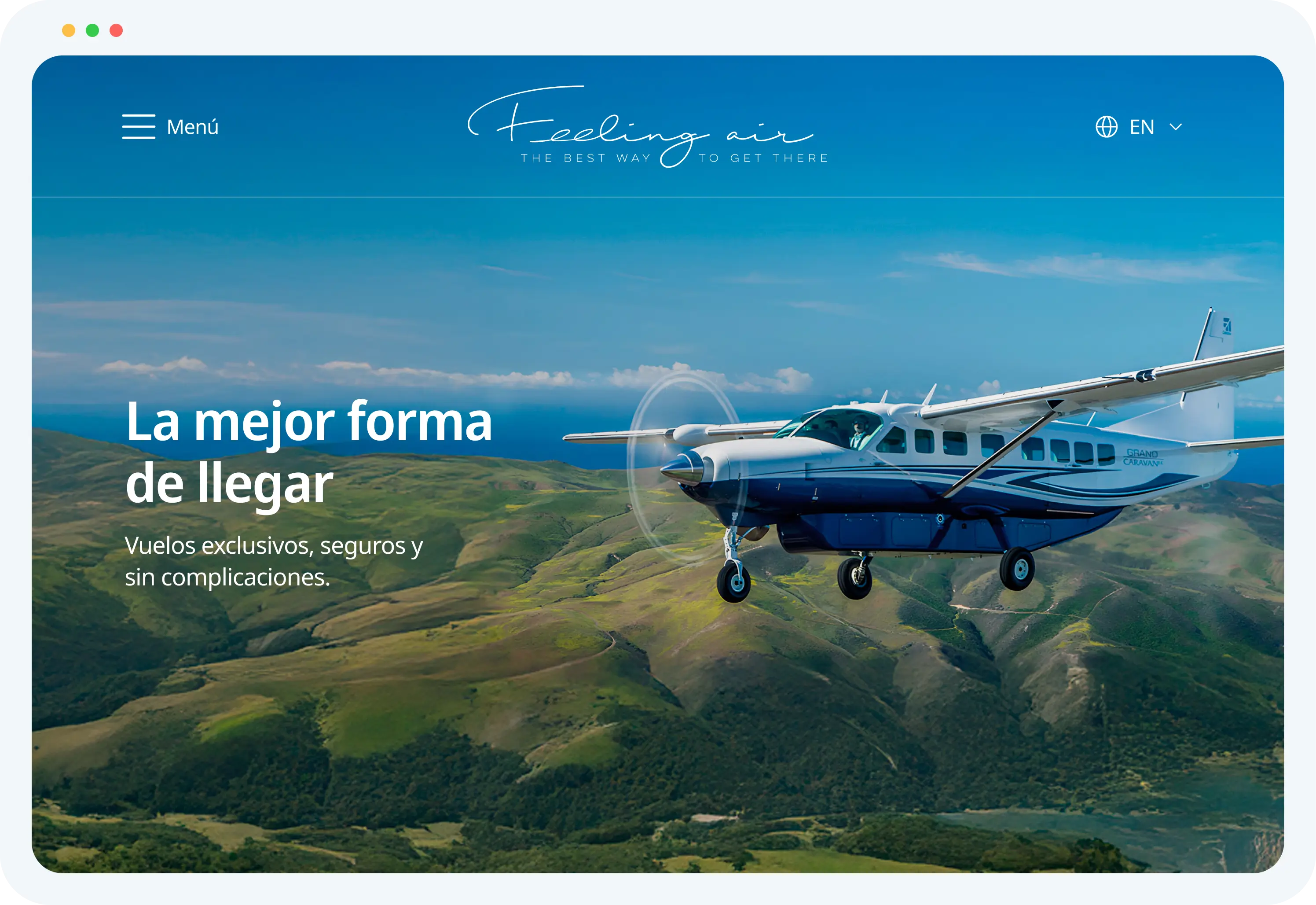 Feeling Air es un proveedor de servicios de aviación privada de primer nivel. Aunque su servicio y su flota estaban a la vanguardia, la experiencia digital no transmitía esa misma calidad. Mi rol fue diseñar la interfaz y la experiencia del sitio web para elevar la propuesta digital de la marca.